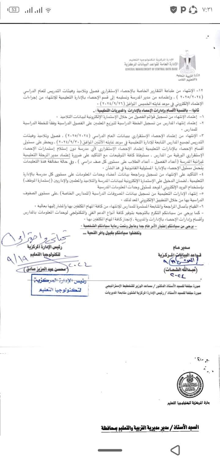 وشددت على ضرورة الإنتهاء من طباعة التقارير الخاصة بالإحصاء الإستقراري، للفصول والتلاميذ وهيئات التدريس للعام الدراسي ( ٢٠٢٥/٢٠٢٤ )، واعتماده من مدير المدرسة وتسليمه إلى قسم الإحصاء بالإدارة التعليمية للانتهاء من إجراءات الإعتماد الإلكتروني في موعد غايته الخميس الموافق (٢٠٢٤/٩/٢٦).