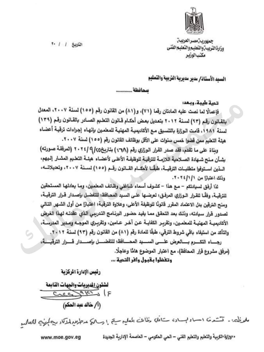 أوضحت وزارة التربية والتعليم والتعليم الفني، أنها قامت بالتنسيق مع الأكاديمية المهنية للمعلمين بإنهاء إجراءات ترقية أعضاء هيئة التعليم ممن قضوا خمس سنوات على الأقل بوظائف القانون رقم (١٥٥) لسنة ٢٠٠٧.
