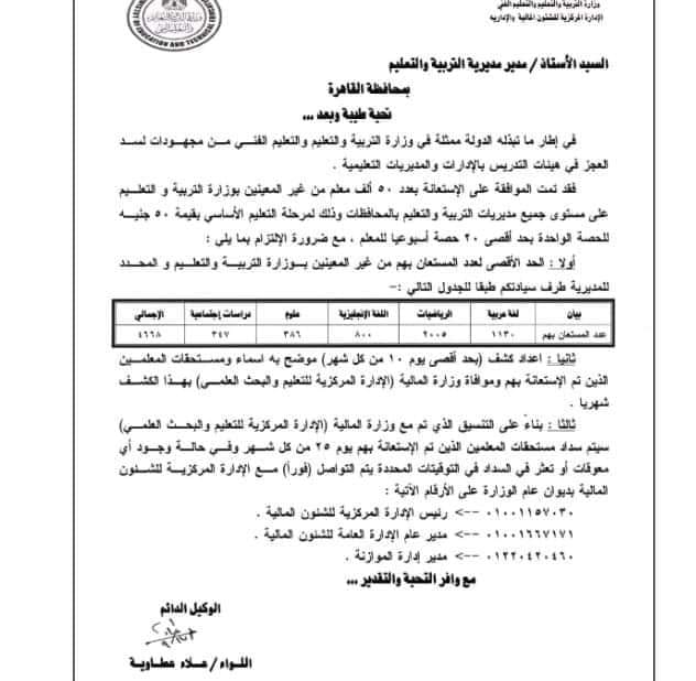 أعلنت وزارة التربية والتعليم والتعليم الفني برئاسة محمد عبداللطيف، موافقتها على الإستعانة بعدد ٥٠ ألف معلم من غير المعينين بوزارة التربية والتعليم على مستوى جميع مديريات التربية والتعليم بالمحافظات وذلك لمرحلة التعليم الأساسي بقيمة ٥٠ جنيها للحصة الواحدة بحد أقصى ٢٠ حصة أسبوعيا للمعلم.