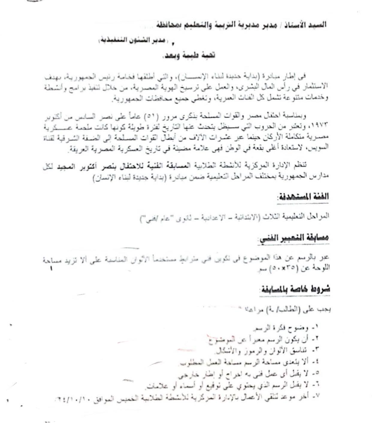 عممت الإدارة المركزية للأنشطة الطلابية بوزارة التربية والتعليم والتعليم الفني، خطابها على المديريات التعليمية بمحافظات جمهورية مصر العربية، بشأن المسابقة الفنية للاحتفال بنصر أكتوبر المجيد لكل مدارس الجمهورية بمختلف المراحل التعليمية ضمن مبادرة بداية جديدة لبناء الإنسان) بهدف الاستثمار في رأس المال البشري، والعمل على ترسيخ الهوية المصرية، من خلال تنفيذ برامج وأنشطة وخدمات متنوعة تشمل كل الفئات العمرية، وتغطى جميع محافظات الجمهورية.
