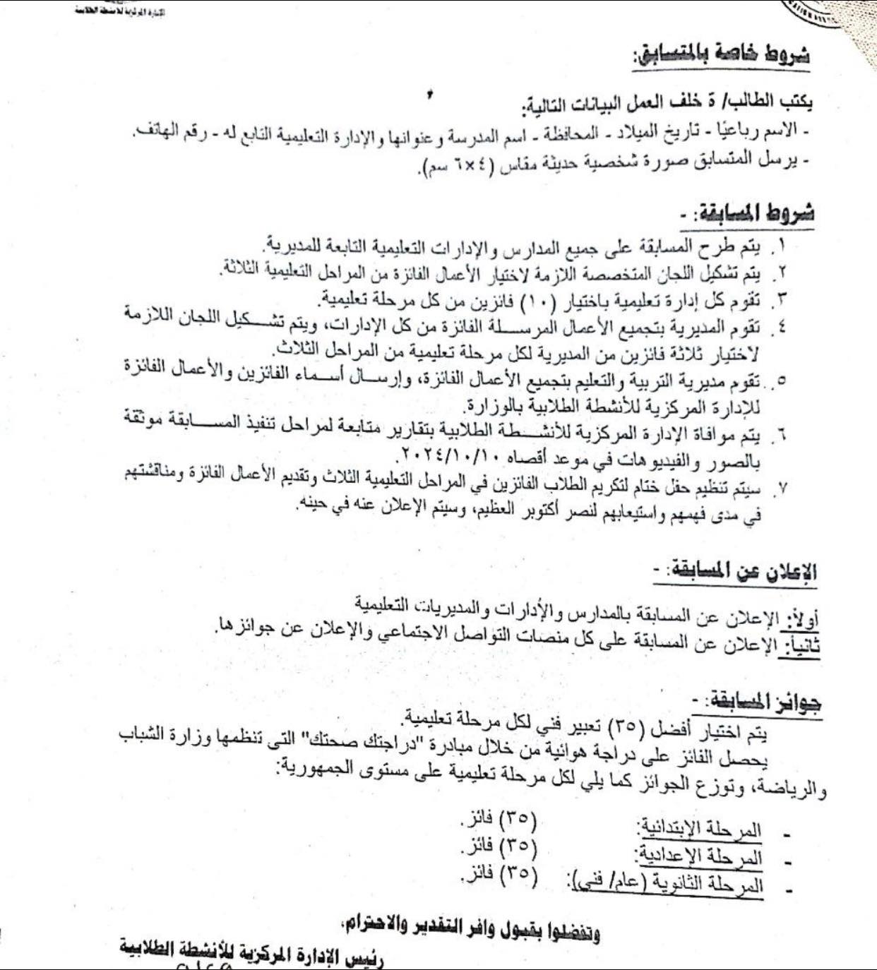- يتم طرح المسابقة على جميع المدارس والإدارات التعليمية التابعة للمديرية.