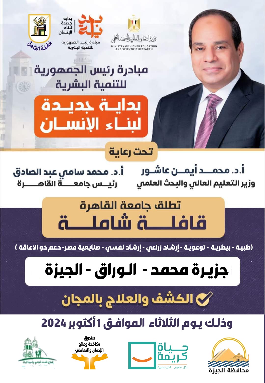 اطلقت جامعة القاهرة، صباح اليوم، قافلة تنموية شاملة لجزيرة محمد بالوراق بمحافظة الجيزة، ضمن مبادرة رئيس الجمهورية "بداية جديدة لبناء الإنسان"، واستمرارًا لسلسلة القوافل التي تطلقها جامعة القاهرة على مستوى الجمهورية في إطار تفعيل دورها الخدمي والتنموي تجاه المجتمع، وذلك بمشاركة التحالف الوطني للعمل الأهلي التنموي، ومحافظة الجيزة، ومؤسسة حياة كريمة، وصندوق مكافحة وعلاج الإدمان والتعاطي، وبنك الكساء المصري.