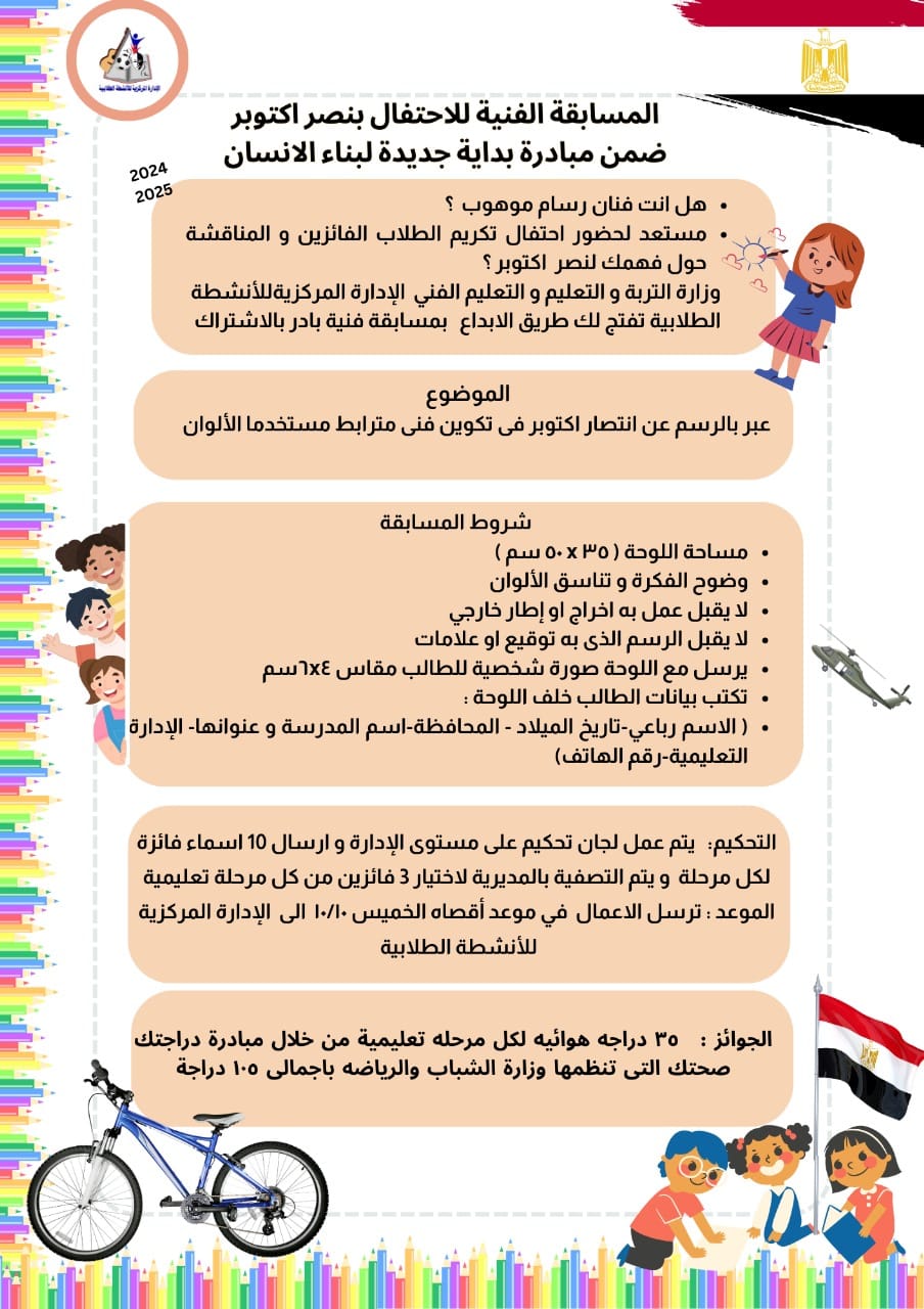 تنظم الإدارة المركزية للأنشطة الطلابية بوزارة التربية والتعليم والتعليم الفني، مسابقة فنية للاحتفال بنصر أكتوبر ضمن مبادرة بداية جديدة لبناء الإنسان.