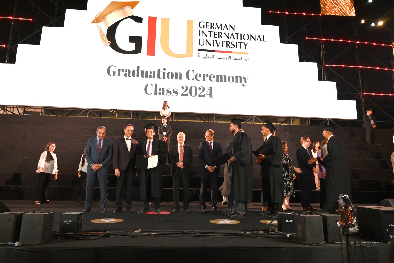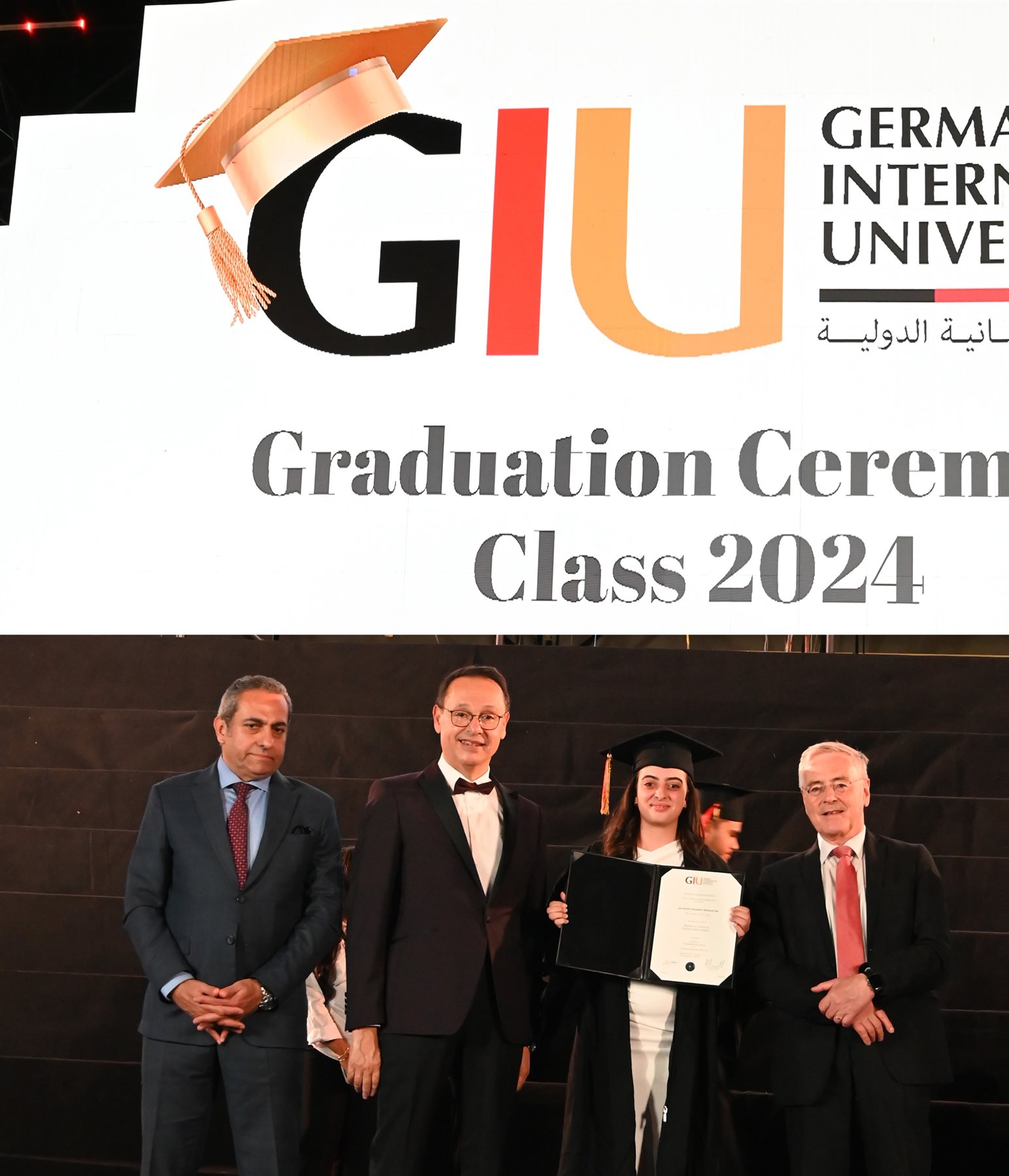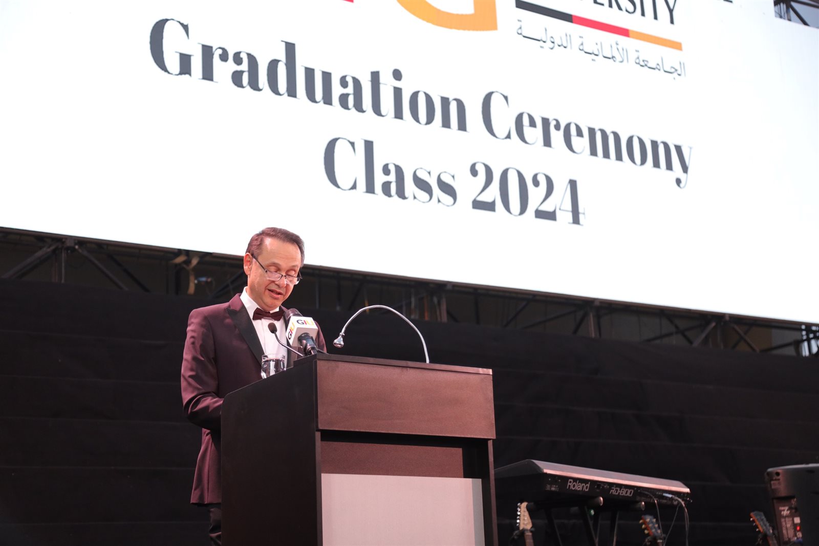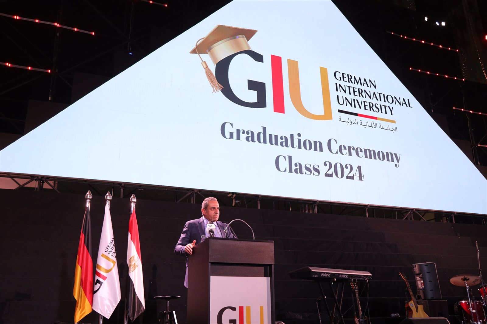 ورحب الرئيس المشارك لمجلس أمناء الجامعة الألمانية الدولية GIU، في سياق كلمته برؤساء اللجان في البرلمان الألماني "البوندستاج" الذين جاءوا خصيصا من ألمانيا لمشاركتنا احتفالية التخرج فهى رسالة حب واحترام تعزز الحوار والعلاقات بين مصر وألمانيا، موضحا أن الجامعة الألمانية بالقاهرة GUC والجامعة الألمانية الدولية GIU يمثلان ٦٠% من إجمالي التعليم العالي الألماني العابر للحدود.