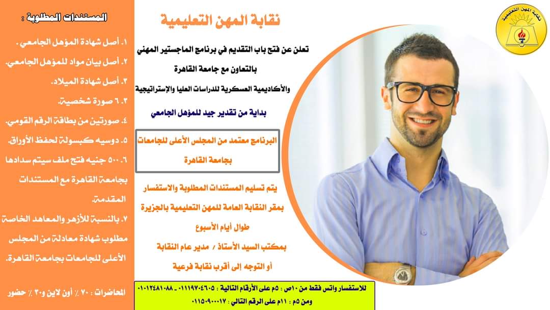 أعلنت نقابة المهن التعليمية، عن فتح باب التقديم في برنامج الماجستير المهني، بالتعاون مع جامعة القاهرة، والأكاديمية العسكرية للدراسات العليا والإستراتيجية بداية من تقدير جيد للمؤهل الجامعي.