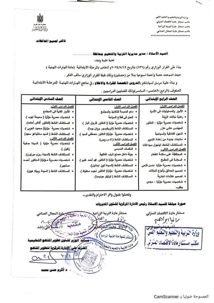 أرسلت وزارة التربية والتعليم والتعليم الفني، خطابا رسميا لجميع المديريات التعليمية، أوضحت خلاله أنه بعد الاكتفاء بتدريس مادة المهارات المهنية بحصة واحدة بدلا من حصتين أسبوعيا، تقرر تحديد دروس للإطلاع للصفوف الرابع والخامس والسادس الابتدائي للعام الدراسي الحالي 2024/2025.