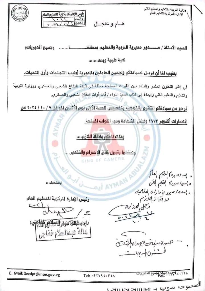 أرسلت الإدارة المركزية للتعليم العام بوزارة التربية والتعليم بقيادة هالة عبد السلام، رئيس الادارة المركزية للتعليم العام، خطابًا إلى المديريات التعليمية بشأن تخصيص الحصص الأولى بدايةً من 7 أكتوبر الجارى عن انتصارات أكتوبر 1973 وفضل الشهادة ودور القوات المسلحة