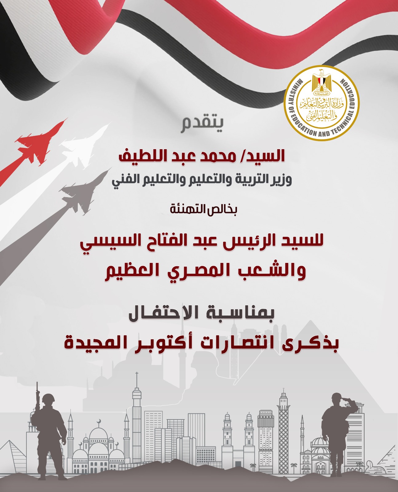 قدم محمد عبد اللطيف وزير التربية والتعليم والتعليم الفني، خالص التهنئة للرئيس عبد الفتاح السيسي رئيس الجمهورية القائد الأعلى للقوات المسلحة وللشعب المصري العظيم بمناسبة حلول الذكرى الـ ٥١ لانتصارات أكتوبر المجيدة..