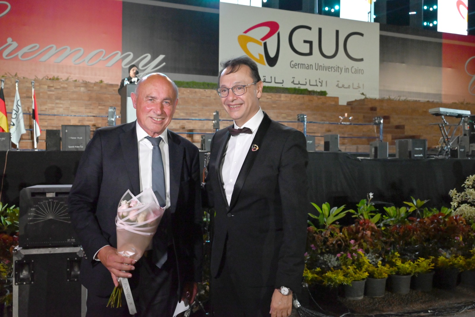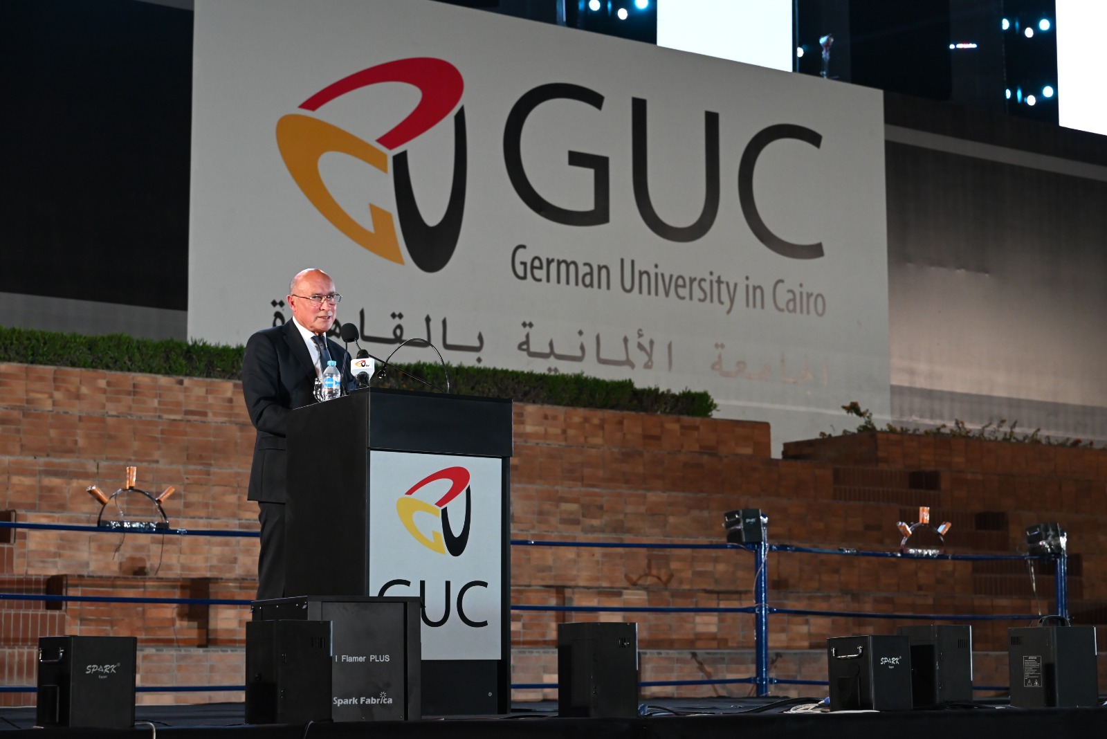 ثم توجه بكلمته للخريجين قائلا: أعزائي الخريجين يجب أن تكونوا سعداء بفرصة الحصول علي تعليم جيد في مثل هذه الجامعة التي تعد مركز للتميز والابتكار، اليوم هو بداية رحلتكم في الحياة، فأنتم سفراء لمصر وألمانيا في العالم وهذا أمر فريد، فالألتزام والحرص على متابعة أهدافكم ومواصلة التعلم والانفتاح علي الثقافات الأخري جميعها أمور مهمة للغاية لحياتكم الشخصية والمهنية، أدعوكم إلى استغلال قدراتكم بكفاءه والعمل على إثرائها لآن العالم يواجه الكتير من التحديات، لذا اشجعكم على احتضان هذه التحديات والمشاركة في تشكيل المستقبل بالمهارات والخبرات والمعرفة التي اكتسبتموها في الجامعة الألمانية فأنتم المحور الأساسي لعالم مستدام وأكثر سلامًا.