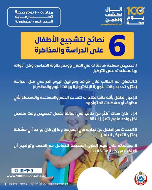 وتضمنت نصائح مبادرة 100 يوم صحة لتشجيع الأطفال على الدراسة والمذاكرة الآتي:
