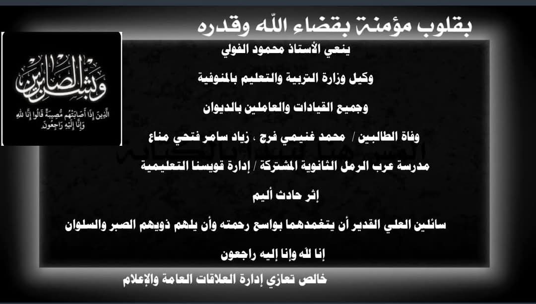 وتقدم محمود الفولي، وكيل وزارة التربية والتعليم بمحافظة المنوفية، وجميع القيادات والعاملين بالديوان العام بخالص العزاء لأسر الطالبين محمد غنيمي وزياد سامر مناع بمدرسة عرب الرمل الثانوية المشتركة، واللذان توفيا في حادث أليم صباح اليوم، سائلين المولى عز وجل أن يتغدمهما بواسع رحمته وأن يلهم أهلهم وذويهم الصبر والسلوان.