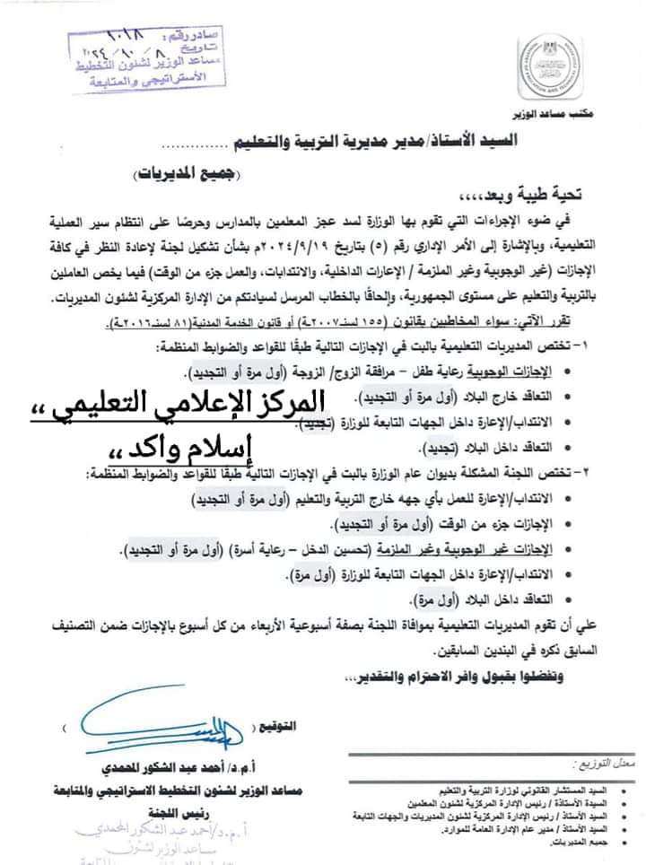 جاء ذلك، حرصًا على انتظام سير العملية التعليمية، وبالإشارة إلى الأمر الإداري رقم (٥) بتاريخ ٢٠٢٤/٩/۱۹، بشأن تشكيل لجنة لإعادة النظر في كافة الإجازات غير الوجوبية وغير الملزمة / الإعارات الداخلية، والانتدابات، والعمل جزء من الوقت فيما يخص العاملين بالتربية والتعليم على مستوى الجمهورية.