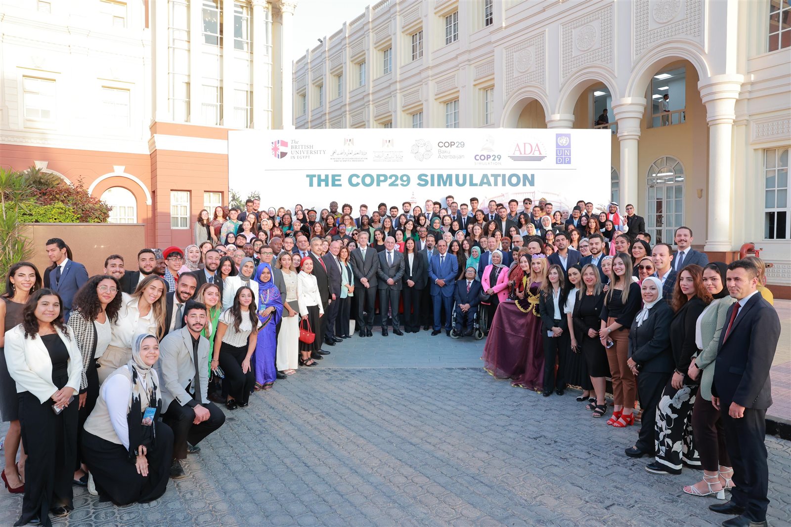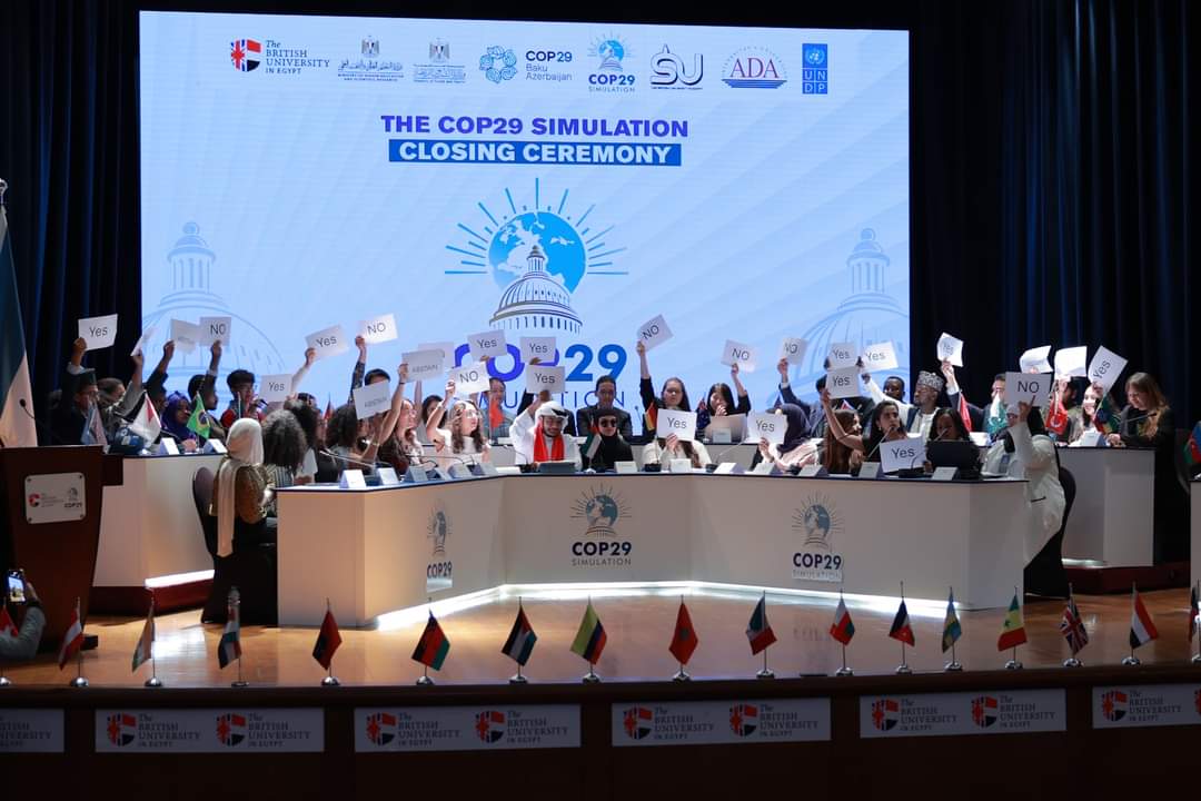 اختتمت الجامعة البريطانية في مصر، وبرنامج الأمم المتحدة الإنمائي في مصر، فعاليات النسخة الثالثة من النموذج الدولي لمحاكاة قمة المناخ COP29simulation، وذلك تحت رعاية وزارتي التعليم العالي والبحث العلمي والشباب والرياضة، وبالتعاون هذا العام مع جامعة ADA بدولة أذربيجان، والذي استمر لمدة ثلاث أيام، في الفترة من 7 وحتى 9 أكتوبر الجاري، بمشاركة 150 طالبًا من 40 دولة حول العالم، بحرم الجامعة بمدينة الشروق.