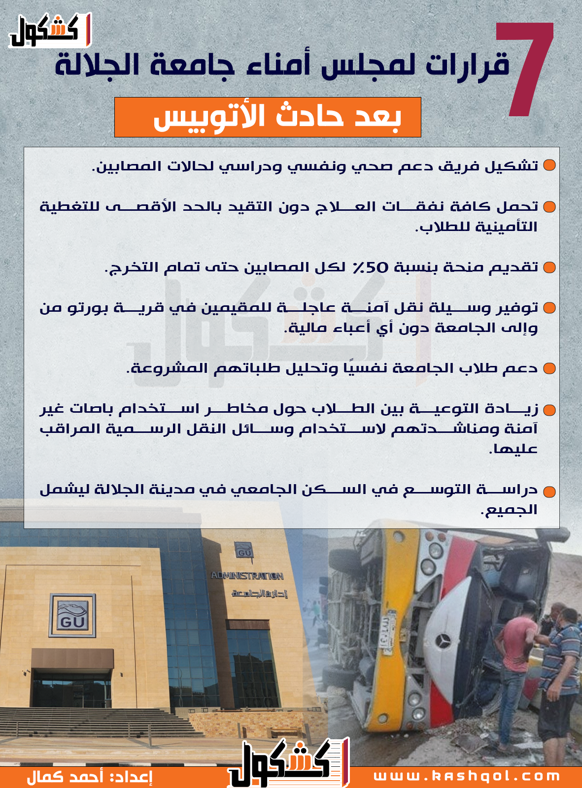 إنفوجراف.. 7 قرارات لمجلس أمناء جامعة الجلالة بعد حادث الأتوبيس