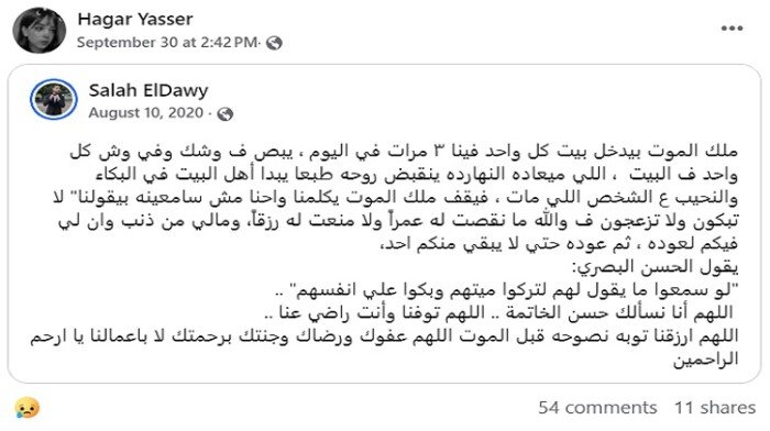 وتابع منشور ضحية حادث الجلالة: «ويقف ملك الموت يكلمنا واحنا مش سامعينه بيقولنا لا تبكون ولا تزعجون في والله ما نقصت له عمرًا ولا منعت له رزقًا، ومالي من ذنب وإن لي فيكم لعودة، ثم عودة حتى لا يبقي منكم أحد، حيث يقول الحسن البصري: لو سمعوا ما يقول لهم لتركوا ميتهم وبكوا على انفسهم، اللهم أنا نسألك حسن الخاتمة.. اللهم توفنا وأنت راضى عنا، اللهم ارزقنا توبة نصوحة قبل الموت اللهم عفوك ورضاك وجنتك برحمتك لا بأعمالنا يا ارحم الراحمين».