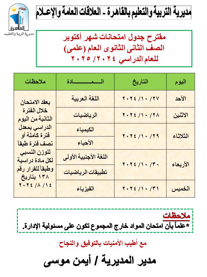 تبدأ الامتحانات، اعتبارًا من يوم الأحد الموافق 27 أكتوبر الحالي، وتستمر حتى الخميس ٣١ من نفس الشهر، وفق الجداول التالية: