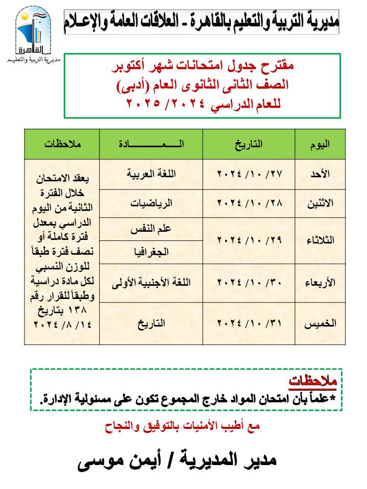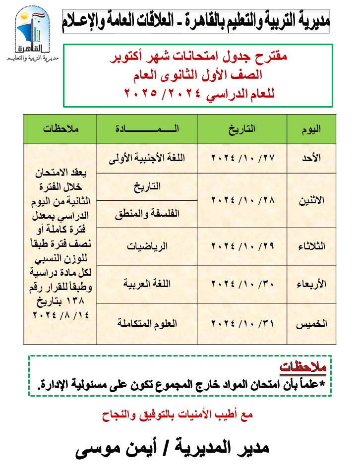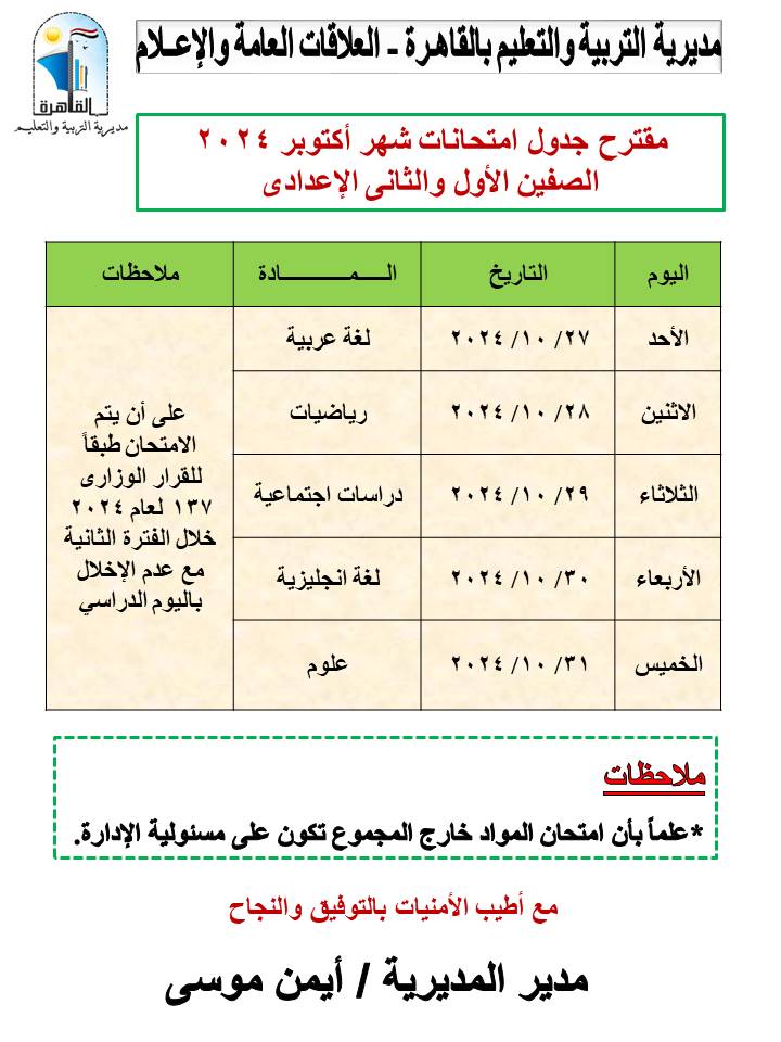 أعلنت مديرية التربية والتعليم بالقاهرة، برعاية أيمن موسى، مدير المديرية، عن مقترح جداول امتحانات شهر أكتوبر للعام الدراسي 2024 - 2025، للمراحل التعليمية الثلاث، (ابتدائي- إعدادي– ثانوي).