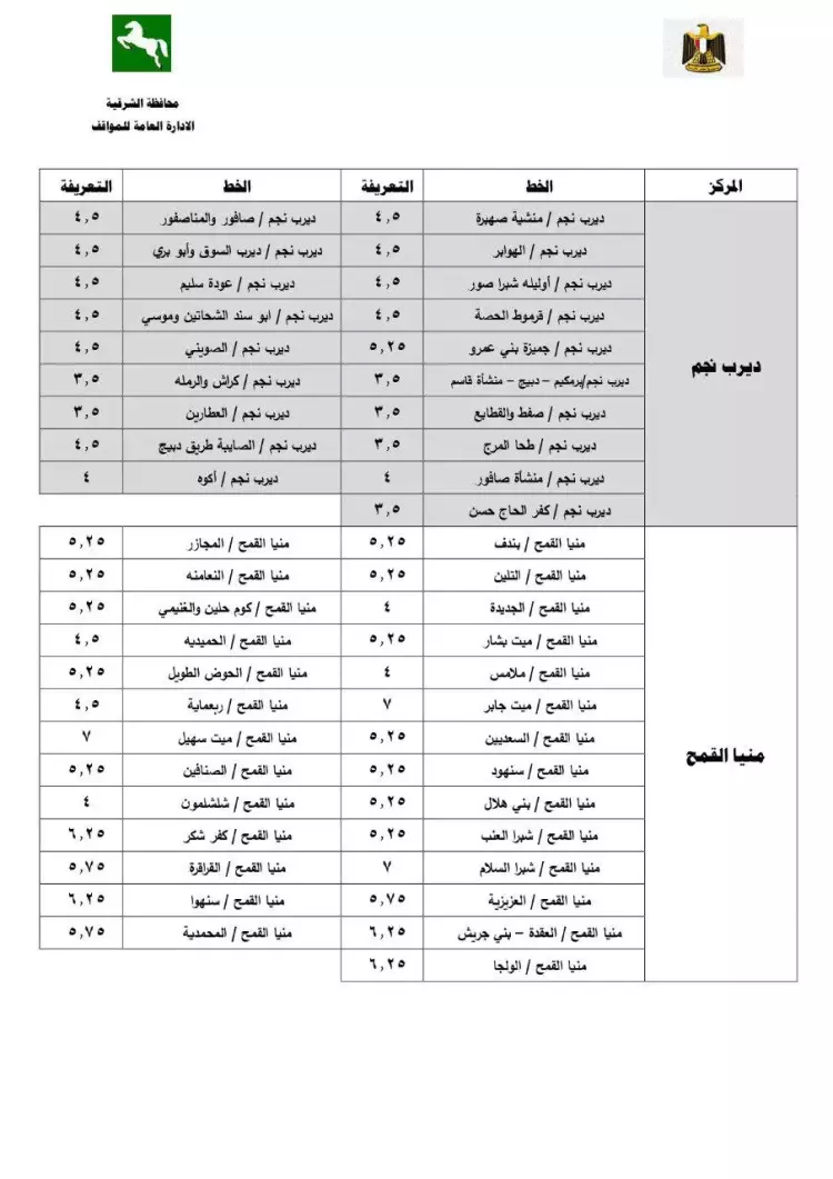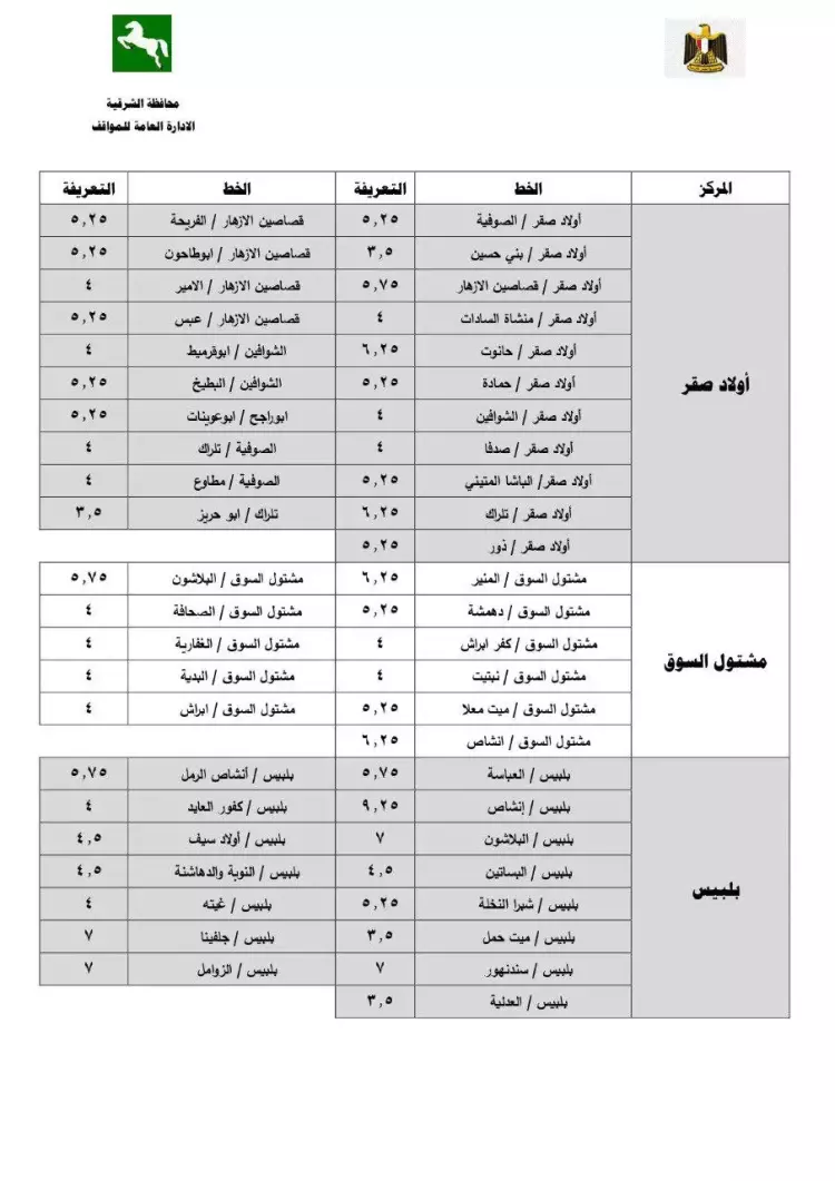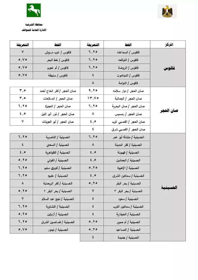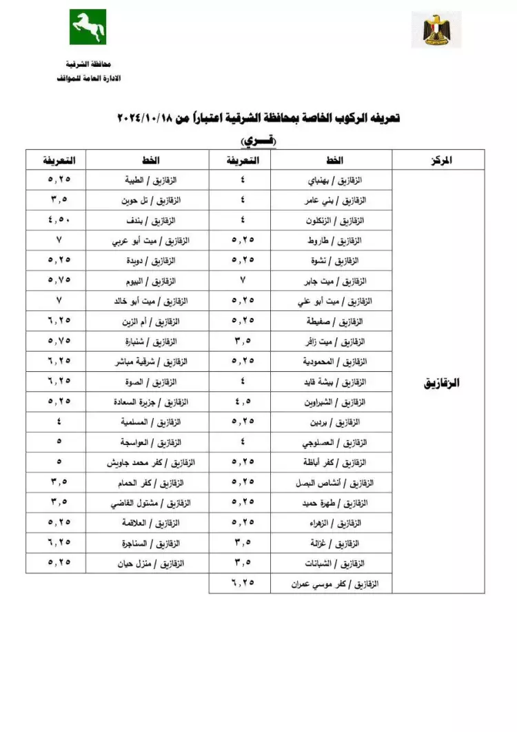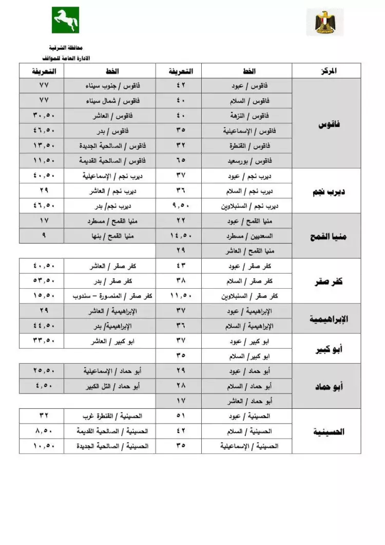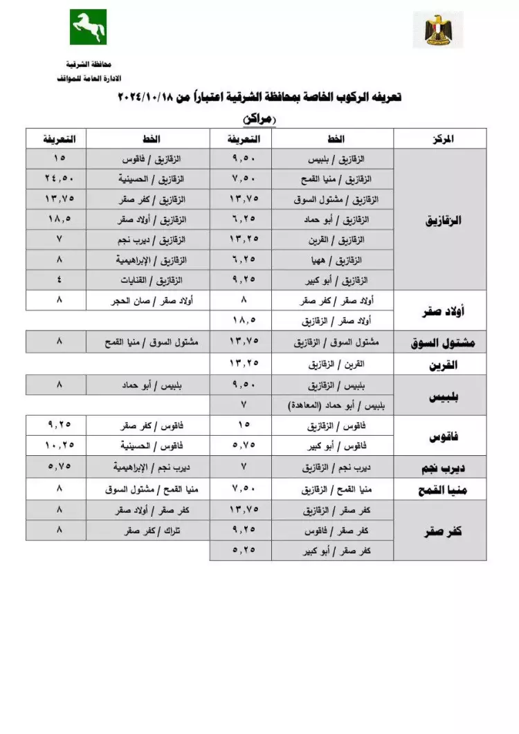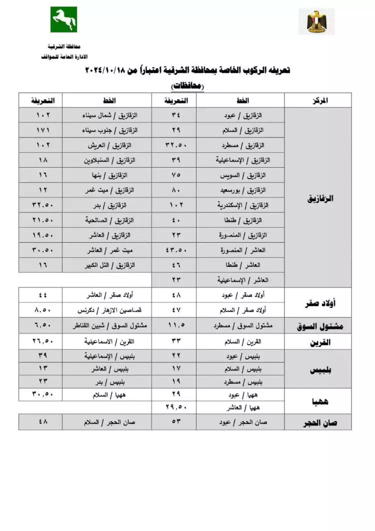 تعريفة ركوب محافظة الشرقية الجديدة 2024