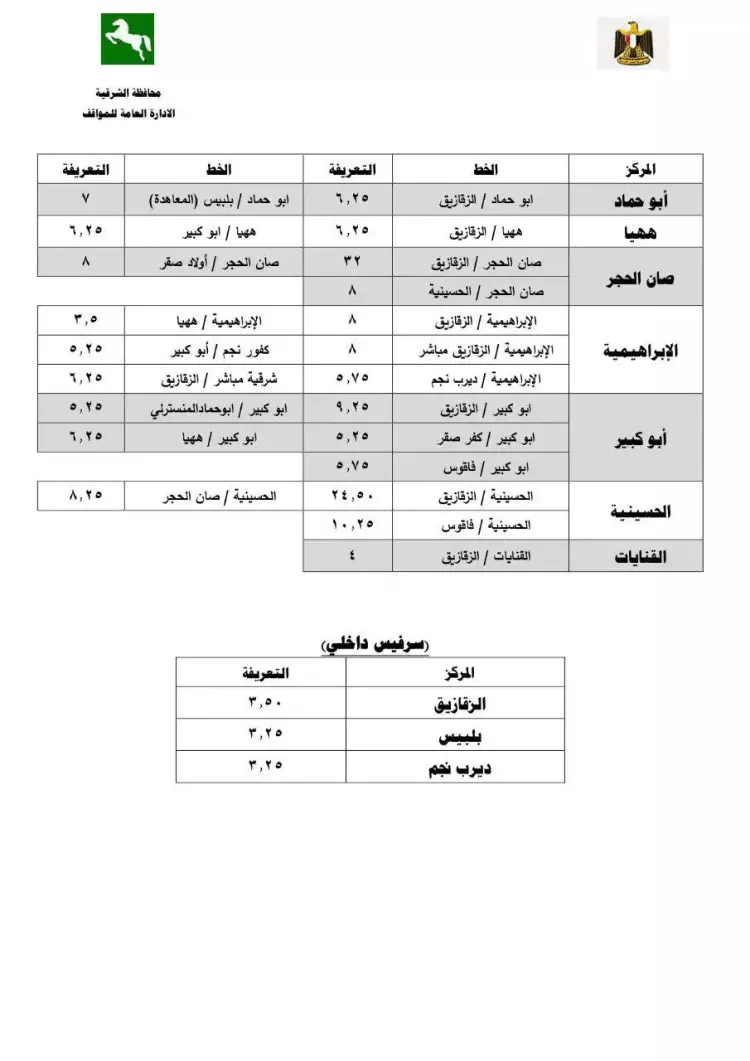 ووفرت صفحة محافظة الشرقية الرسمية على موقع التواصل الاجتماعي «الفيسبوك» جداول تعريفة المواصلات الجديدة في محافظة الشرقية وكانت أهمها: