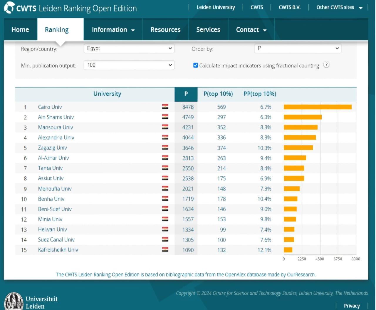 حققت جامعة القاهرة برئاسة الدكتور محمد سامي عبد الصادق رئيس الجامعة إنجازًا عالميًا جديدًا بتواجدها ضمن أفضل 200 جامعة على مستوى العالم بحصولها على المركز 164 من بين جامعات العالم التي خضعت لتصنيف "ليدن" الهولندي - إصدار أكتوبر 2024، حيث تصدرت جميع الجامعات الإفريقية والمصرية في التصنيف وجاءت بعدها جامعات عين شمس (400) والمنصورة (454) والإسكندرية (481) والزقازيق (533) والأزهر (695) وطنطا (764) وأسيوط (765) والمنوفية (920) وبنها (1033) وبني سويف (1081) والمنيا (1123) وحلوان (1236) وقناة السويس (1248) وكفر الشيخ (1387).