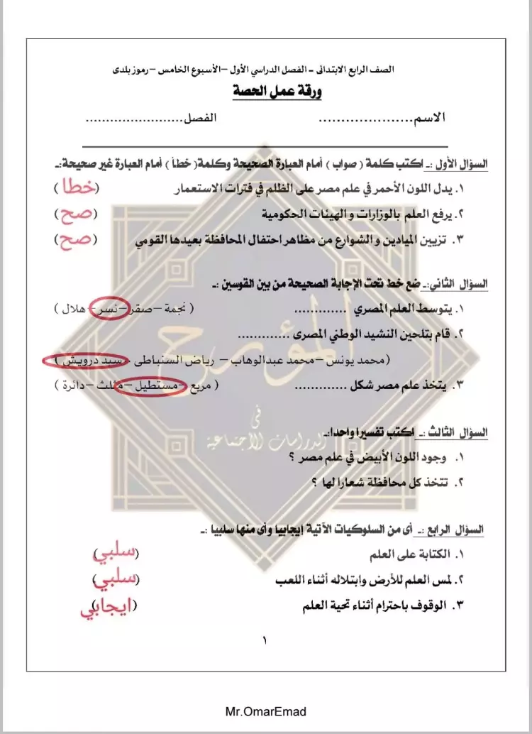 أجاب عدد من المدرسيين على أسئلة الأداء الصفي الأسبوع الخامس في مادة الدراسات الاجتماعية لطلاب الصف الرابع الابتدائي على النحو التالي: