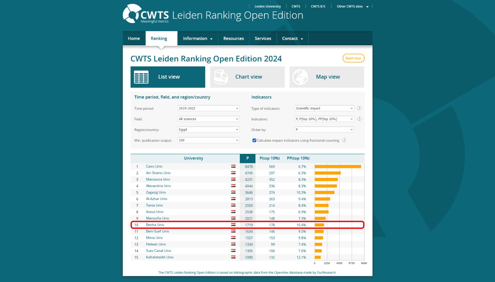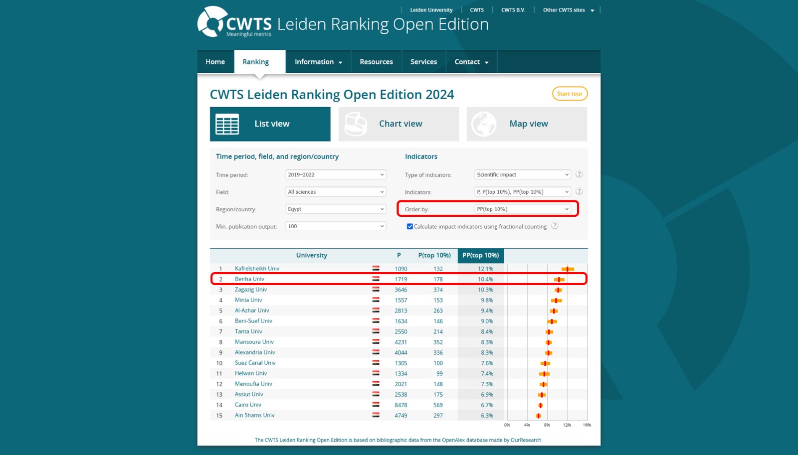 جامعة بنها تتقدم 105 مركز عالميا بمؤشر التأثير العلمي بتصنيف ليدن الهولندي 2024