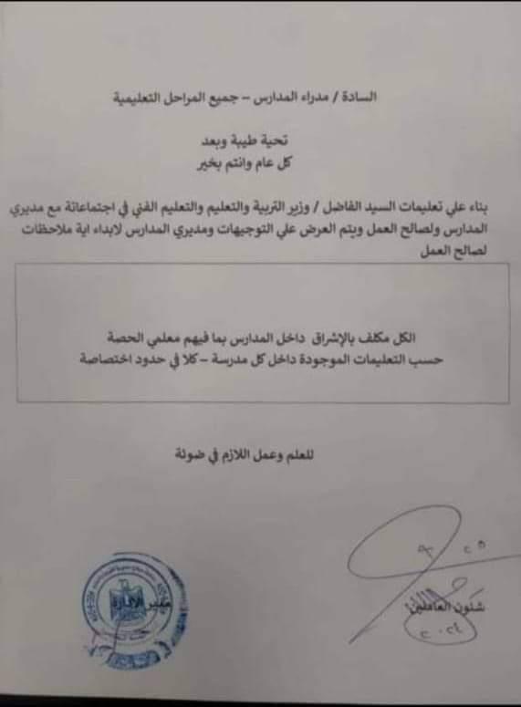 وقالت المديريات إنه بناء على تعليمات وزير التربية والتعليم والتعليم الفني في اجتماعاته مع مديري المدارس ولصالح العمل ويتم العرض على التوجيهات ومديري المدارس لإبداء أية ملاحظات لصالح العمل، الكل مكلف بالإشراف داخل المدارس بما فيهم معلمي الحصة حسب التعليمات الموجودة داخل كل مدرسة - كلا في حدود اختصاصه.