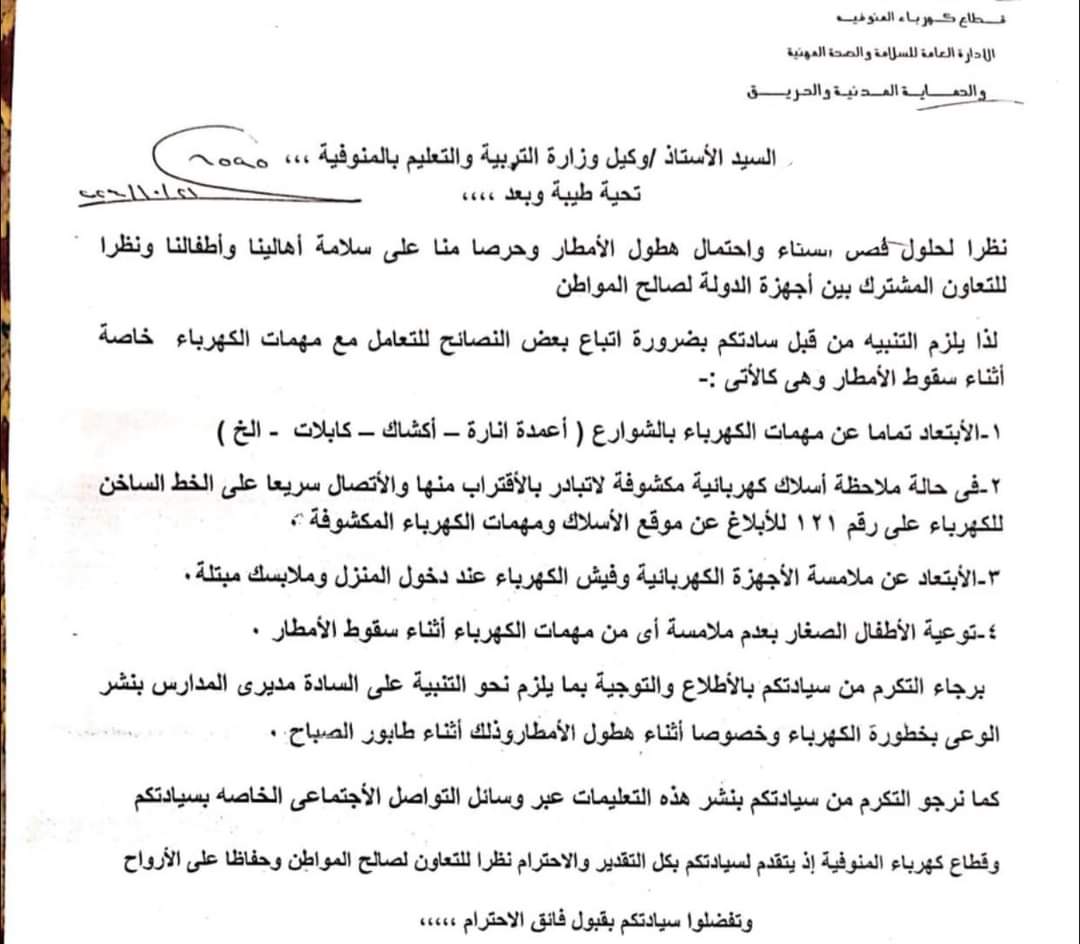 - الإطلاع والتوجيه بما يلزم نحو التنبيه على مديري المدارس بنشر الوعى بخطورة الكهرباء وخصوصا أثناء هطول الأمطار وذلك أثناء طابور الصباح.