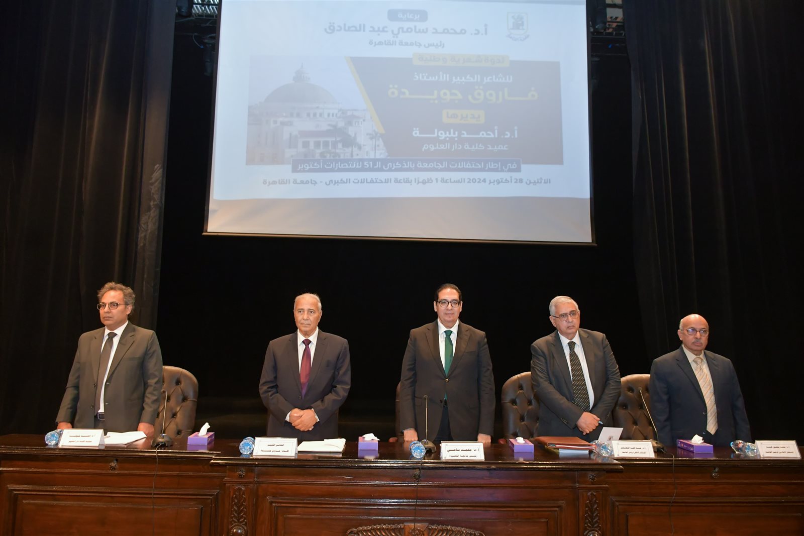 تواصل جامعة القاهرة، فعاليات الموسم الثقافي للعام الدراسي 2024/2025، واحتفالاتها بالذكرى الـ 51 لانتصارات حرب أكتوبر المجيدة، حيث شهدت قاعة الاحتفالات الكبري بحضور الدكتور محمد سامى عبد الصادق رئيس جامعة القاهرة ندوة شعرية وطنية للشاعر والكاتب الصحفي الكبير فاروق جويدة.
