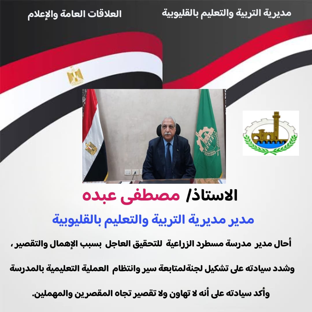 أحال مصطفى عبده وكيل وزارة التربية والتعليم بالقليوبية، مدير مدرسة مسطرد الزراعية للتحقيق العاجل، وذلك بسبب الإهمال والتقصير.