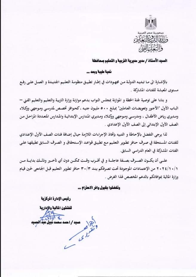 وأكدت وزارة التربية والتعليم، على ضرورة أن يكون الصرف بصفة عاجلة وفي أقرب وقت ممكن دون أي تأخير وذلك بداية من ۲۰۲٤/١٠/١ من الإعتمادات الموجودة تحت تصرفكم ببند ۳۰/۳ حافز تطوير التعليم قبل الجامعي لحين قيام وزارة المالية بموافاة المديريات بالدعم المخصص لهذا الغرض.