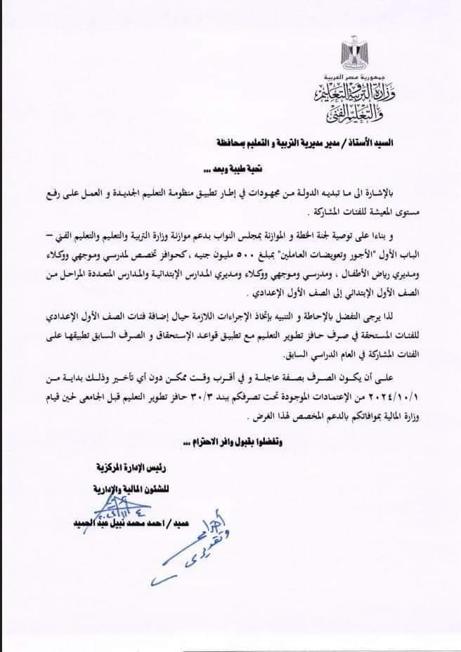 ونص الخطاب على أنه بالإشارة إلى ما تبديه الدولة من مجهودات في إطار تطبيق منظومة التعليم الجديدة والعمل على رفع مستوى المعيشة للفئات المشاركة.. وبناء على توصية لجنة الخطة والموازنة بمجلس النواب بدعم موازنة وزارة التربية والتعليم والتعليم الفني- الباب الأول «الأجور وتعويضات العاملين بمبلغ 500 مليون جنيه»، كحوافز تخصص المدرسي وموجهي ووكلاء ومديري رياض الأطفال، ومدرسي وموجهي ووكلاء ومديري المدارس الابتدائية والمدارس المتعددة المراحل من الصف الأول الابتدائي إلى الصف الأول الإعدادي.