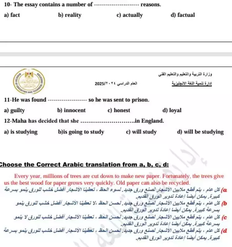 مرفق بالأسفل الملفات المنشورة من قبل الوزارة، ومثال الأسئلة الواردة فيها ما يلي: