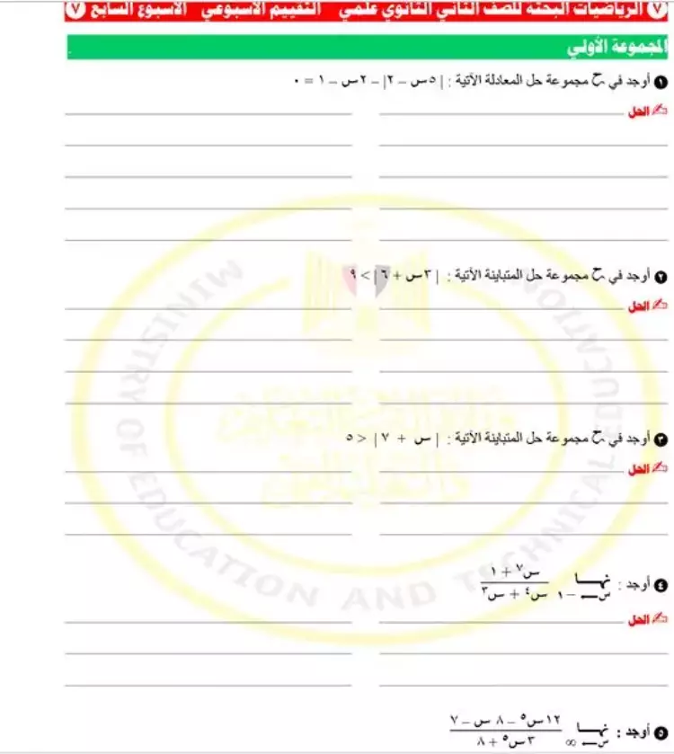 نشرت وزارة التربية والتعليم والتعليم الفني تقييمات الأسبوع السابع من الفصل الدراسي الأول للعام 2024-2025 في مادة الرياضيات البحتة للصف الثاني الثانوي بالشعبة العلمية.