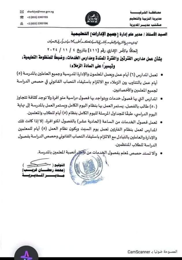 جاء نصه كالتالي:« إلحاقا بالأمر الإداري رقم [٤١١] بتاريخ ٤ / ١١ / ٢٠٢٤ بشأن عمل مدارس الفترتين والفترة الممتدة ومدارس الخدمات، وضبطا للمنظومة التعليمية، وتيسيرًا على المعلمين يتم الالتزام بالآتي:
