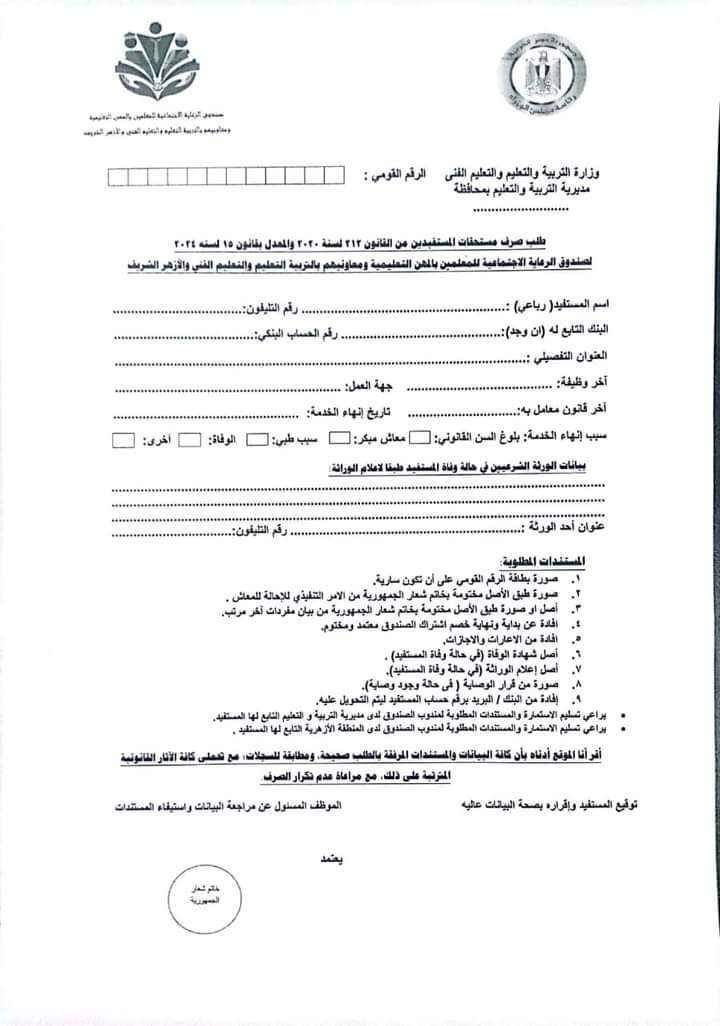 الأوراق المطلوبة لصرف مستحقات المعلمين بالمعاش من صندوق الرعاية الاجتماعية
