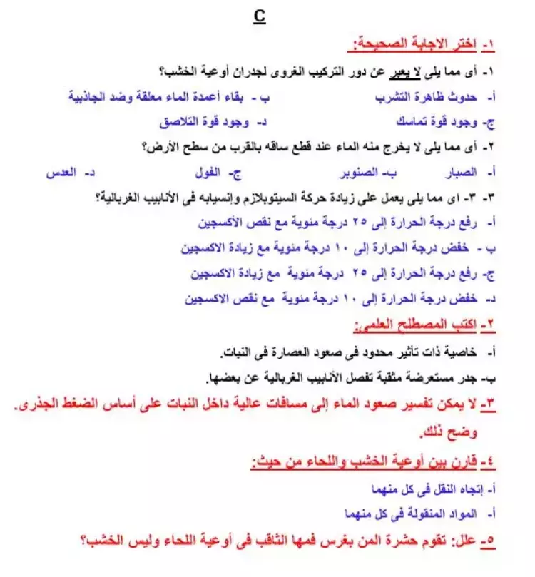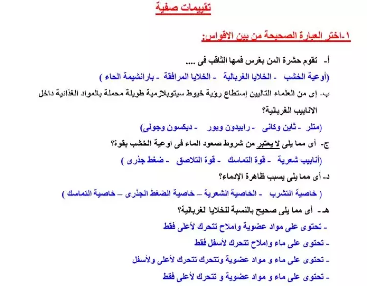 3- أي مما يلي لا يعتبر من شروط صعود الماء في أوعية الخشب بقوة؟ (أنابيب شعرية – قوة التماسك – قوة التلاصق – الضغط الجذري)