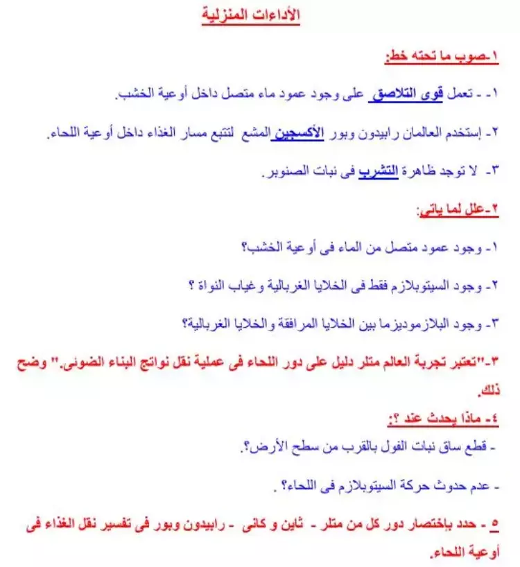 5- أي مما يلي صحيح بالنسبة للخلايا الغربالية؟ (تحتوي على مواد عضوية وأملاح تتحرك لأعلى فقط – تحتوي على ماء وأملاح تتحرك لأسفل فقط – تحتوي على ماء ومواد عضوية وتتحرك لأعلى ولأسفل – تحتوي على ماء ومواد عضوية تتحرك لأعلى فقط)
