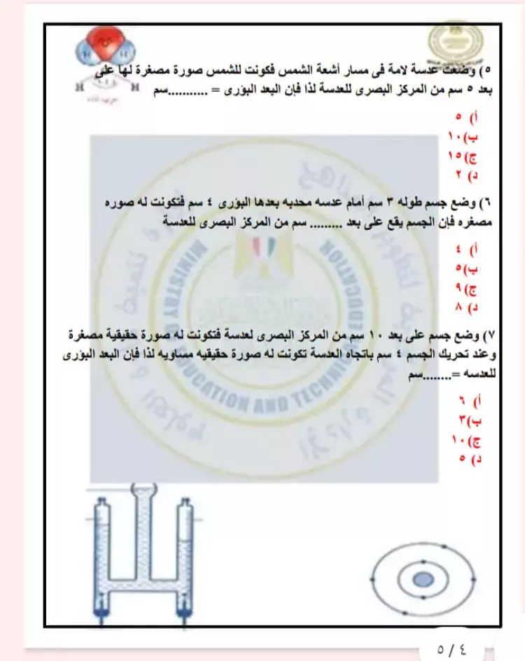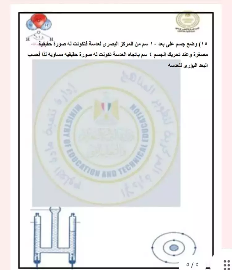 وضعت عدسة لامة في مسار أشعة الشمس فكونت للشمس صورة مصغرة لها على بعد 5 سم من المركز البصري للعدسة لذا فإن البعد البؤري =.......... سم