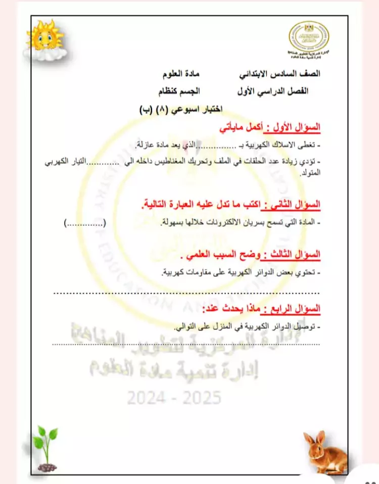 التقييم الأسبوعي للصف السادس الابتدائي علوم الأسبوع الثامن 2024