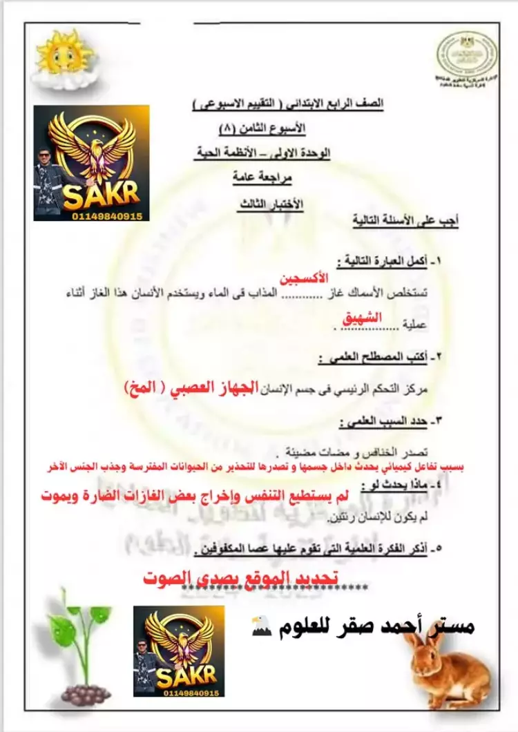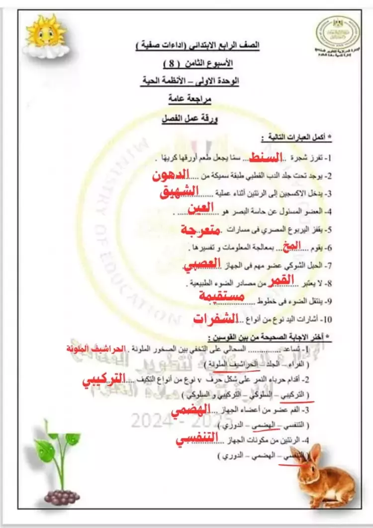 التقييم الأسبوعي للصف الرابع الابتدائي علوم الأسبوع الثامن 2024