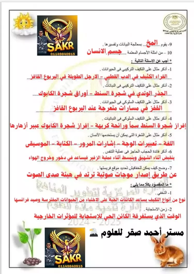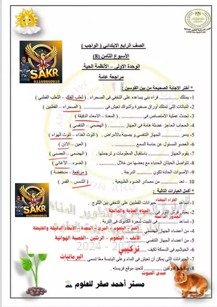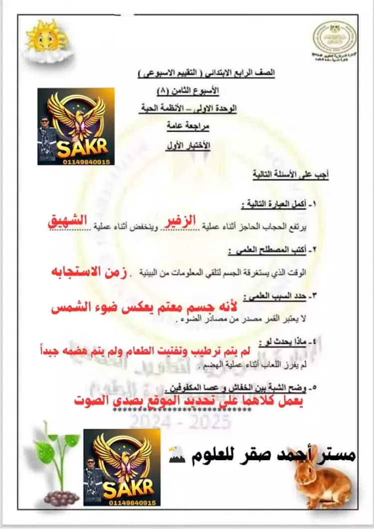 حل الواجب المنزلي والأداء الصفي للصف الرابع الابتدائي علوم الأسبوع الثامن 2024