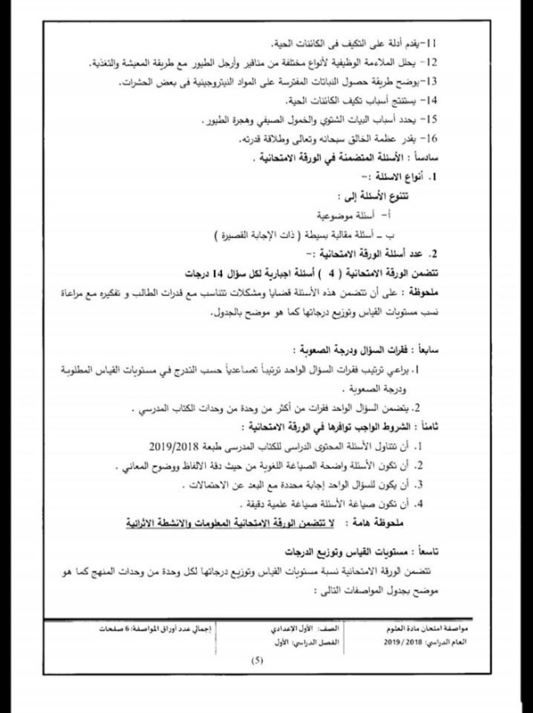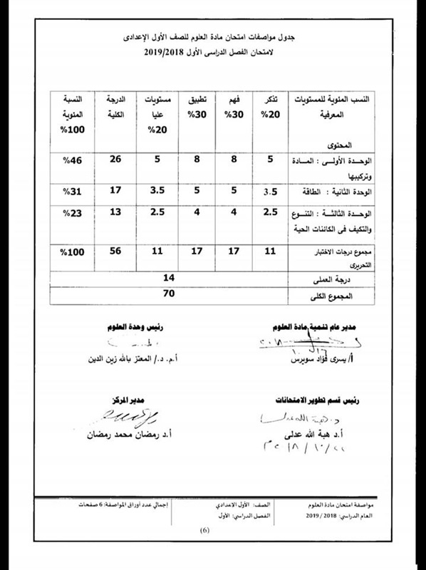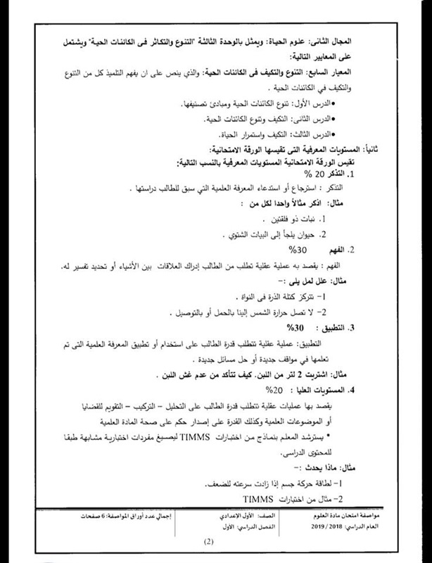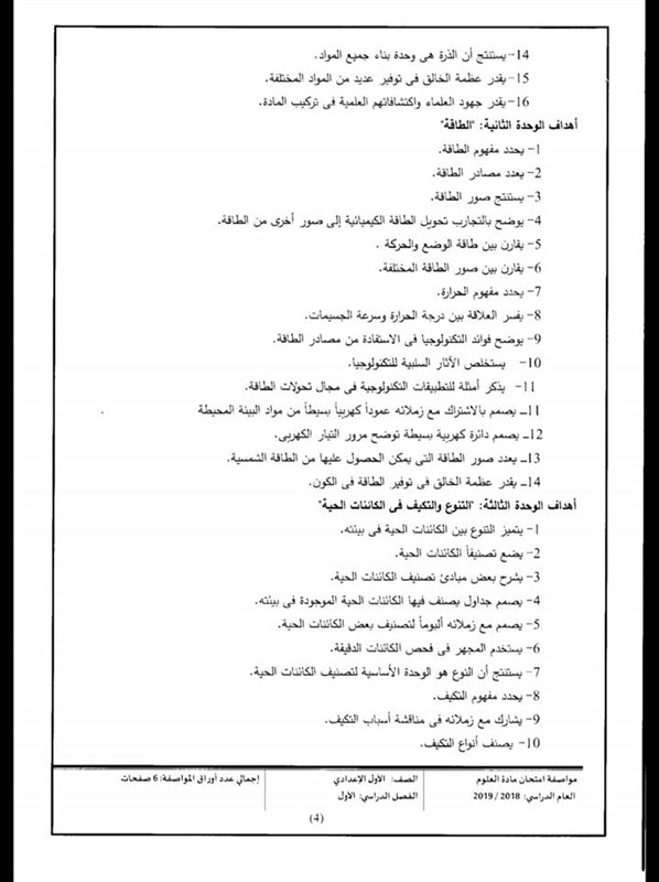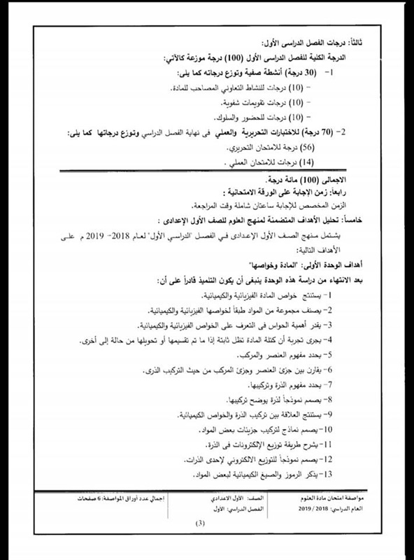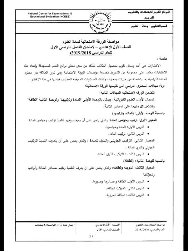 أعلن المركز القومى للامتحانات والتقويم التربوى التابع لوزارة التربية والتعليم والتعليم الفنى، مواصفات الورقة الامتحانية لمادة العلوم للصف الأول الإعدادي لامتحان الفصل الدراسي الأول للعام الدراسى 2019/2018، والتى جاءت كالتالى: