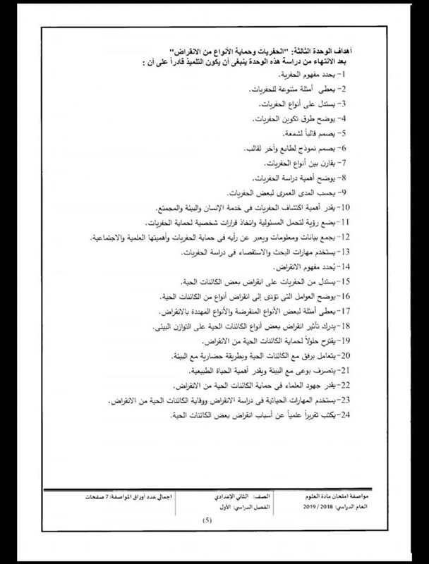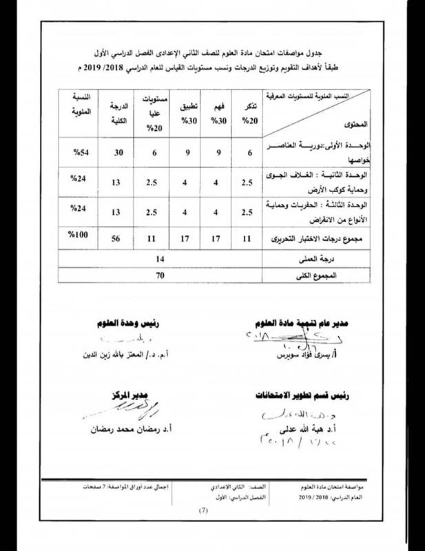 أعلن المركز القومى للامتحانات والتقويم التربوى التابع لوزارة التربية والتعليم والتعليم الفنى، مواصفات الورقة الامتحانية لمادة العلوم للصف الثاني الإعدادي لامتحان الفصل الدراسي الأول للعام الدراسى 2019/2018، والتى جاءت كالتالى: