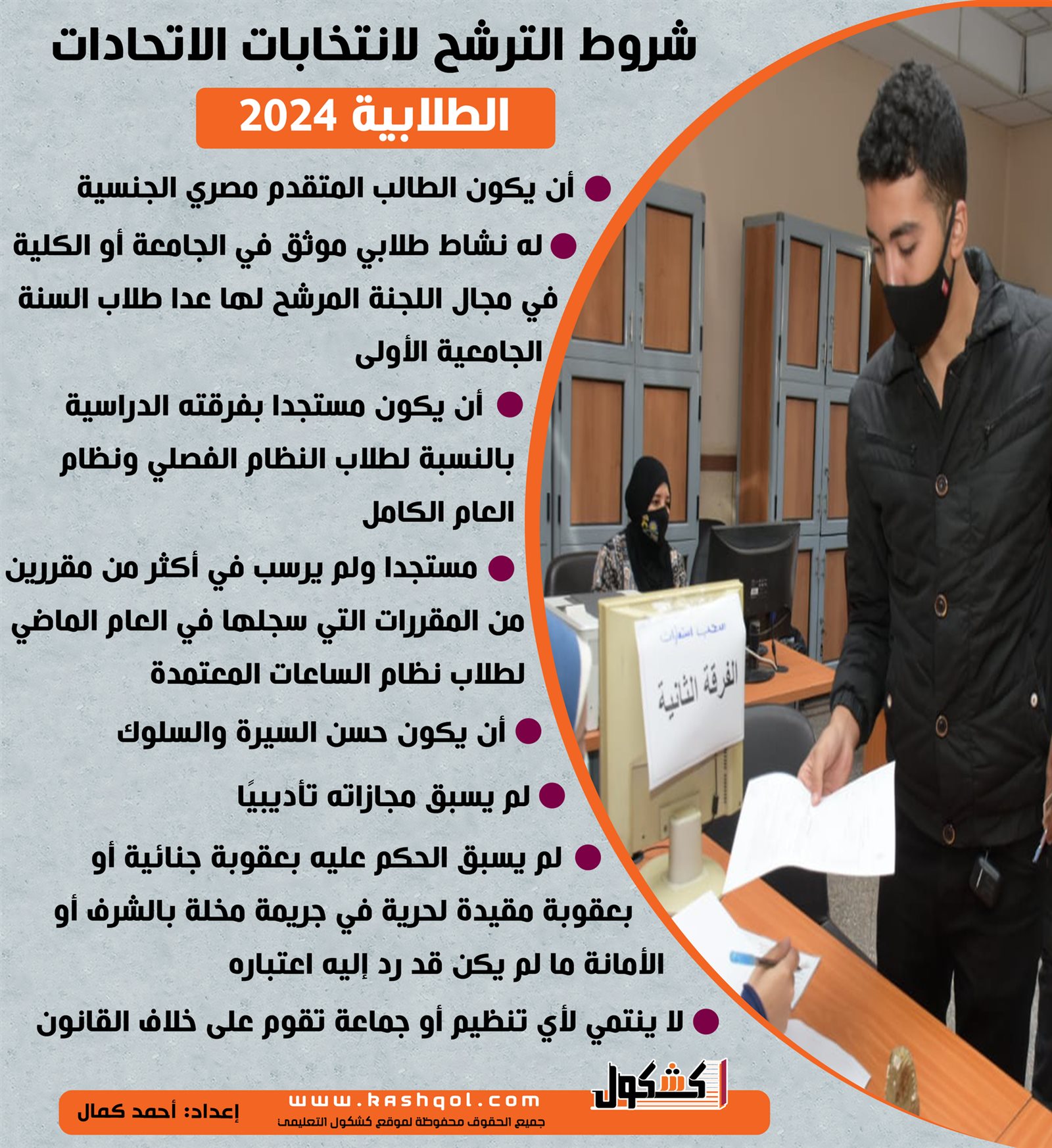 ننشر في الانفوجراف التالي شروط للترشيح لانتخابات الاتحادات الطلابية 2024: