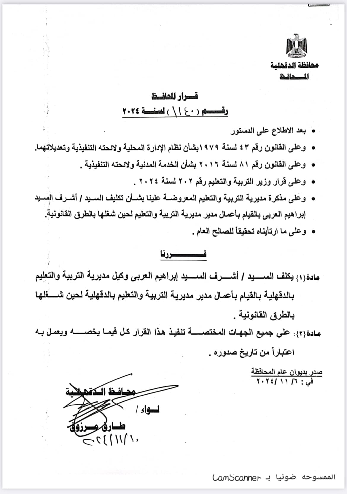 أصدر اللواء طارق مرزوق محافظ الدقهلية القرار رقم ( ١١٤٠ ) لسنة ٢٠٢٤ بشأن تكليف الدكتور أشرف السيد إبراهيم العربي مديرًا لمديرية التربية والتعليم بالدقهلية