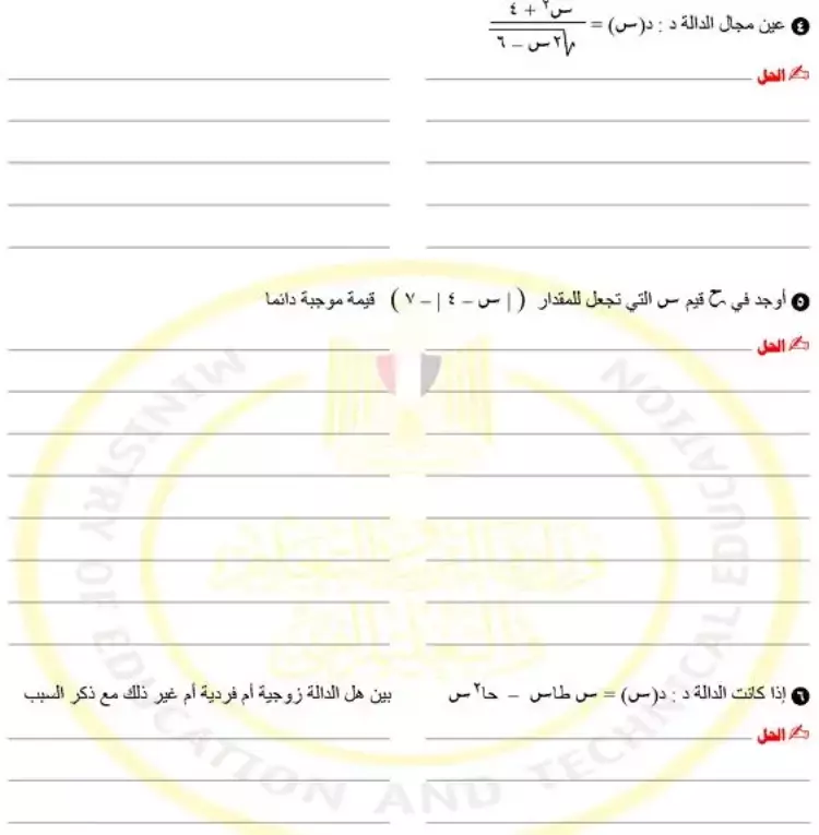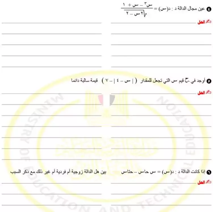 9- ارسم الشكل البياني للدالة د: د (س) = 2 – (1 / س – 1) ومن الرسم حدد مجال ومدى الدالة وابحث أطرادها واذكر هل هي أحادية أم لا.