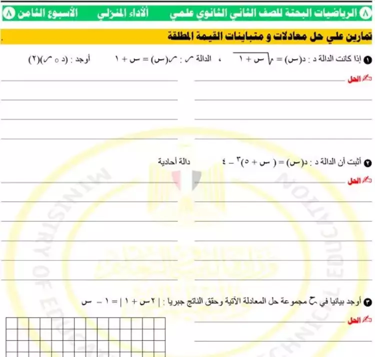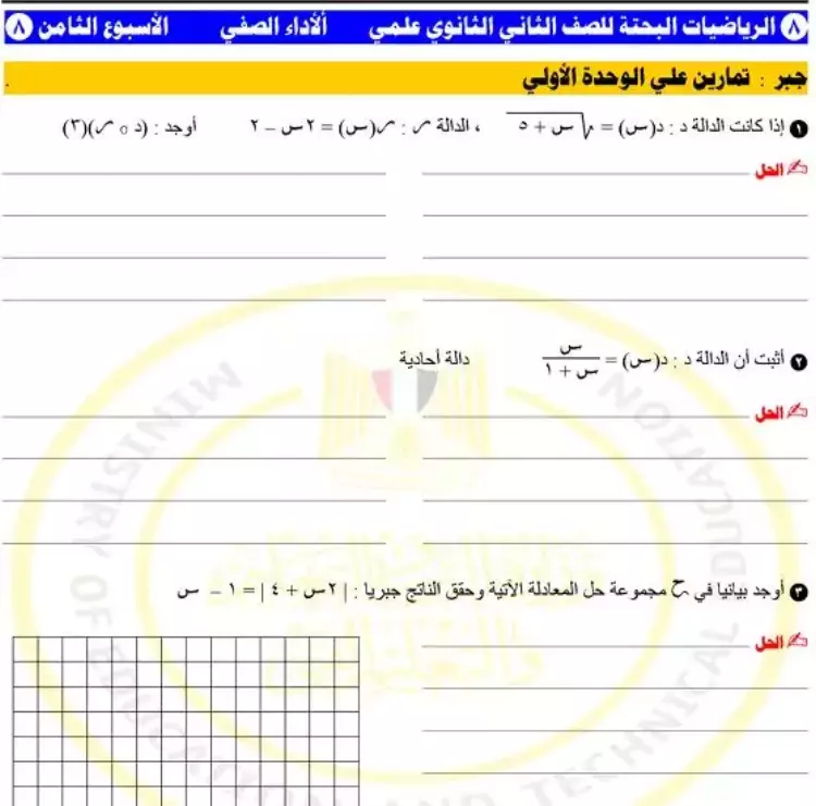 الواجب والأداء الصفي وتقييم الأسبوع الثامن الرياضيات البحتة للصف الثاني الثانوي 2024