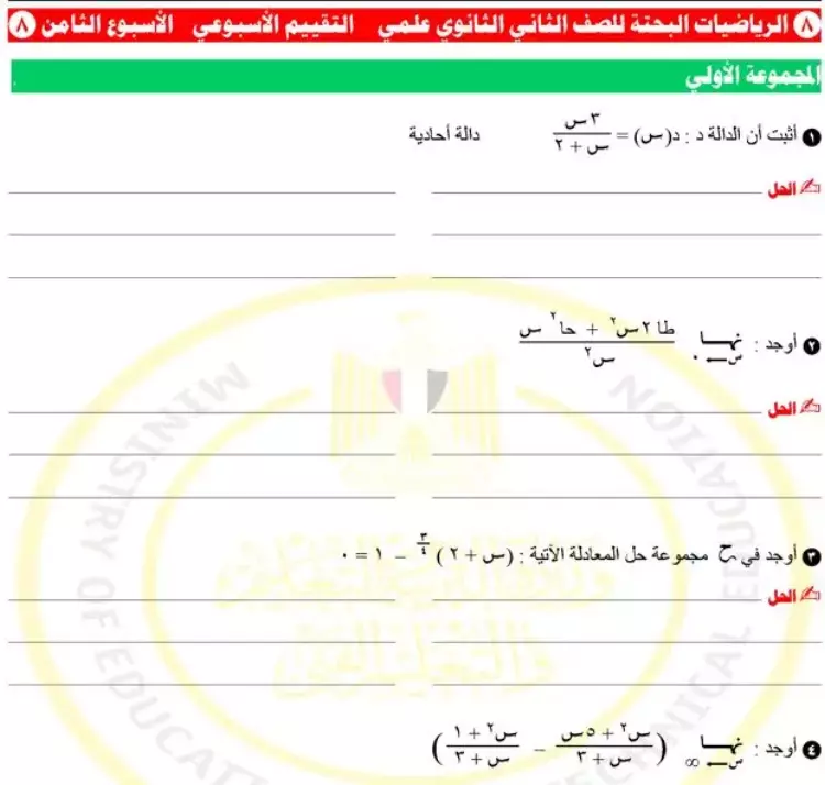 تقييمات الأسبوع الثامن رياضيات بحتة تانية ثانوي 2024