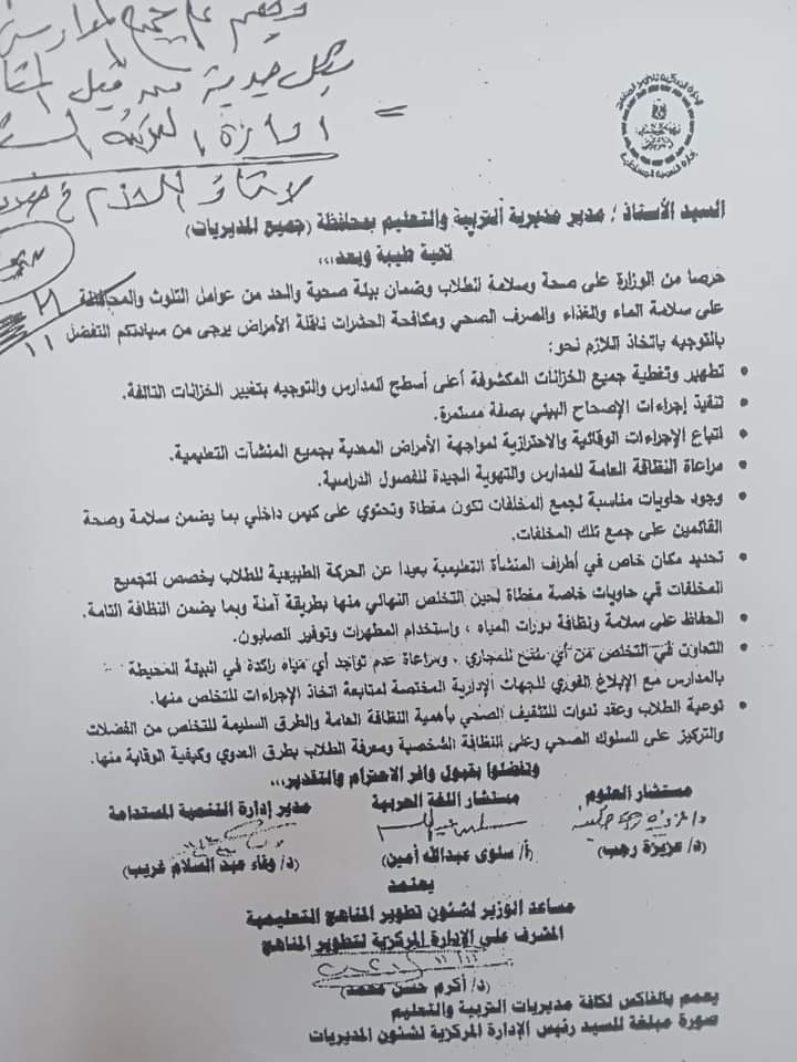 عممت وزارة التربية والتعليم والتعليم الفني، خطابا على المديريات التعليمية بشأن الحفاظ على صحة وسلامة الطلاب وضمان بيئة صحية والحد من عوامل التلوث والمحافظة على سلامة الماء والغذاء والصرف الصحي ومكافحة الحشرات ناقلة الأمراض.